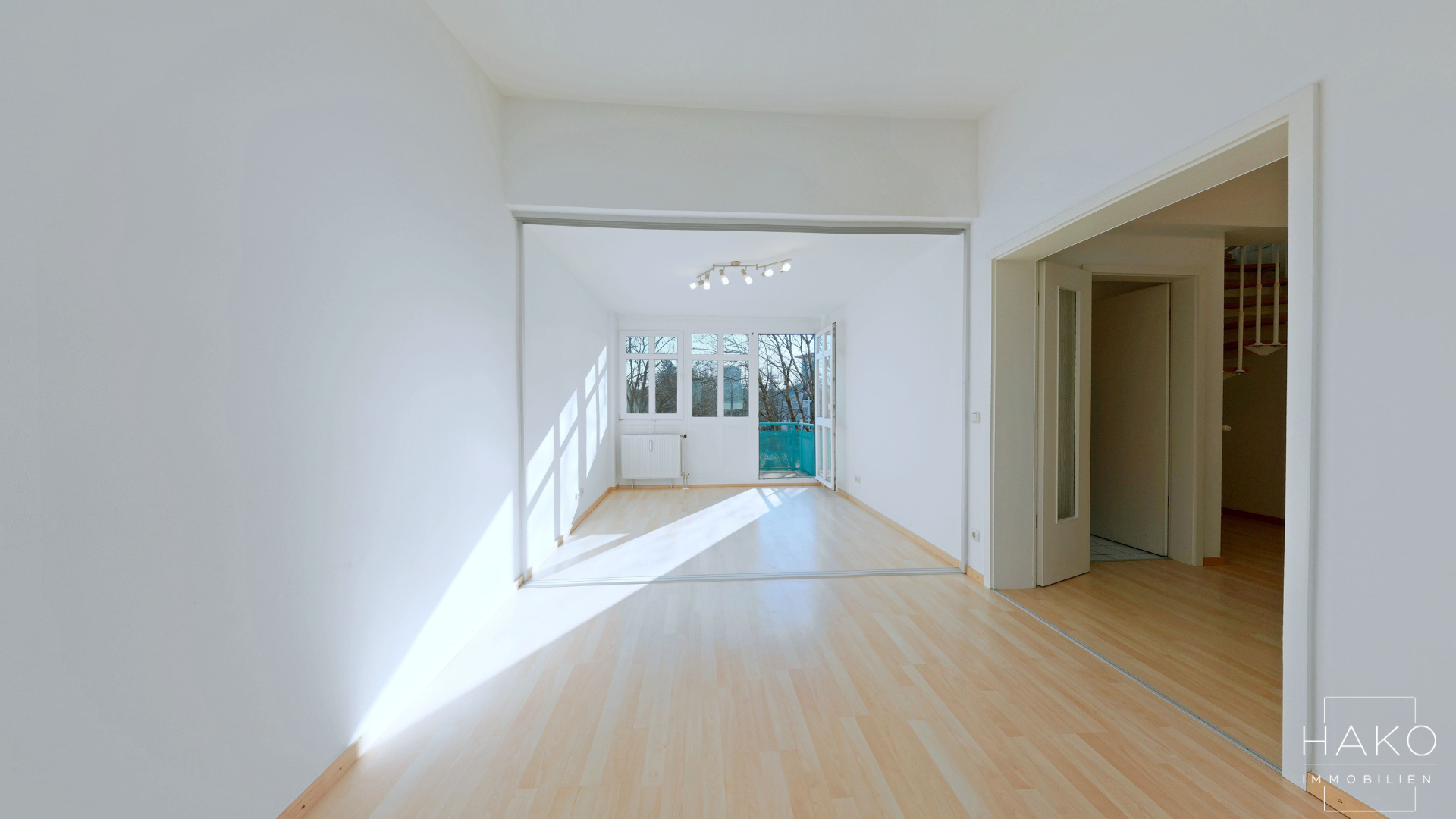 Das Herzstück der Wohnung ist das großzügige Wohnzimmer, das durch ein 3-teiliges Schiebetürelement flexibel in Wohn- und Essbereich unterteilt werden kann. Vom Wohnzimmer aus gelangt man auf den sonnigen Südbalkon, der zum Entspannen einlädt. Die separate Küche ist mit einer modernen Einbauküche ausgestattet und verfügt über einen praktischen Abstellraum. Ein Tageslicht-Duschbad mit Waschmaschinenanschluss rundet das Raumangebot auf dieser Ebene ab.