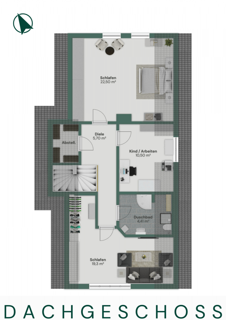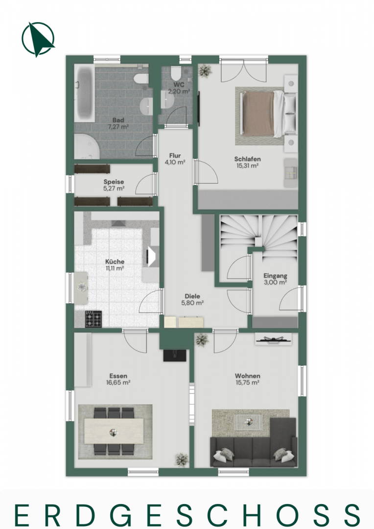 Im Erdgeschoss empfängt Sie ein Eingangsbereich mit anschließender Diele und Flur. Die Küche liegt praktisch angebunden an den großzügigen Essbereich, der fließend in den angrenzenden Wohnbereich übergeht. Ein Kamin im Essbereich sorgt hier für eine besonders behagliche Atmosphäre. Ergänzt wird diese Etage durch eine praktische Speisekammer, ein Tageslicht-Bad, ein separates WC sowie ein Schlafzimmer. Im Dachgeschoss befinden sich eine Diele, zwei weitere Schlafzimmer, ein Kinder- oder Arbeitszimmer, ein Duschbad sowie eine Abstellkammer, wodurch sich das Haus ideal für Familien mit Platzbedarf eignet.