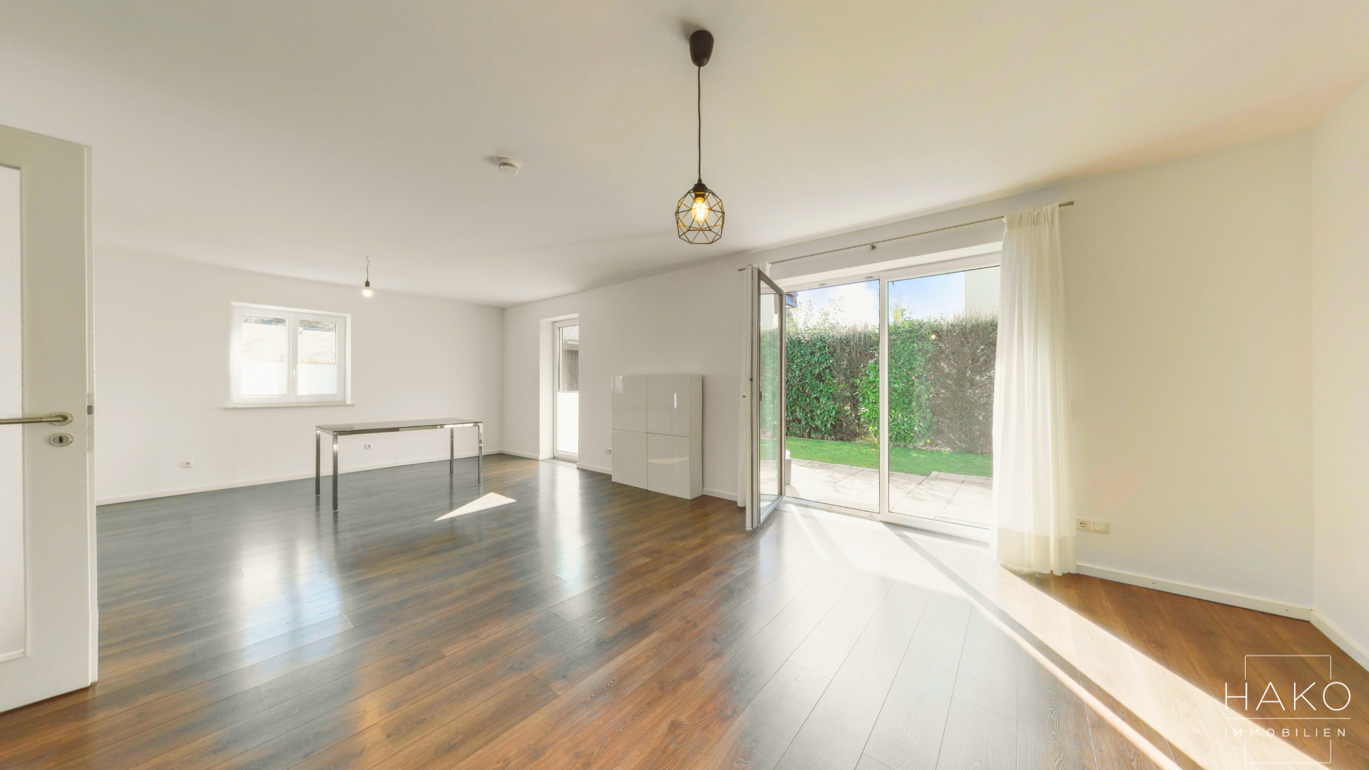 Das Herzstück der Wohnung bildet der großzügige Wohn- und Essbereich, der sich durch bodentiefe Fenster nahtlos zur sonnigen Südterrasse und dem privaten Garten öffnet. Hier genießen Sie das ganze Jahr über viel natürliches Licht und einen ungestörten Rückzugsort im Grünen – ideal zum Entspannen und Unterhalten.