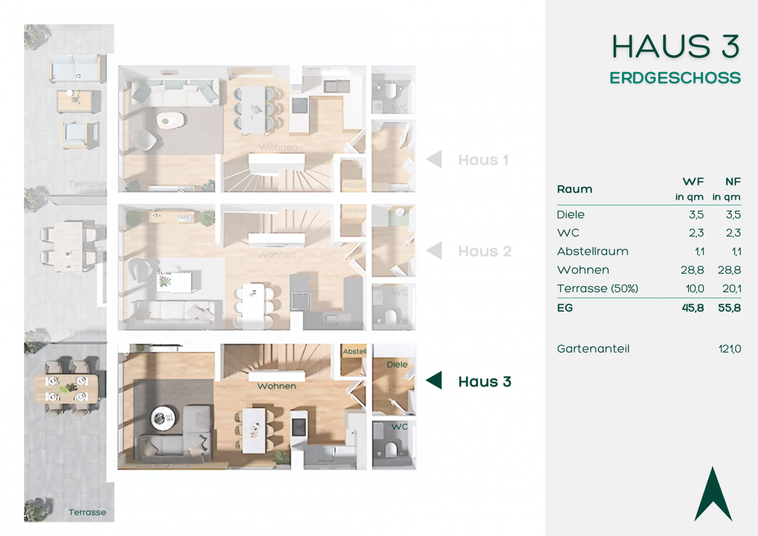Auf einem sonnigen Grundstück in zentraler Lage von Baldham-Vaterstetten entstehen drei moderne und hochwertig gebaute Reihenhäuser.