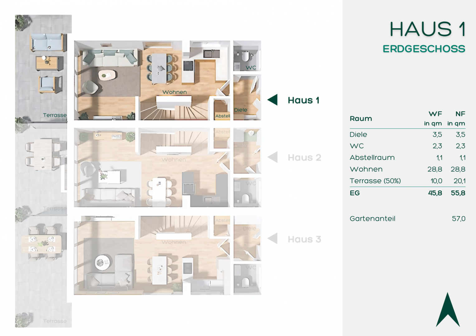 Auf einem sonnigen Grundstück in zentraler Lage von Baldham-Vaterstetten entstehen drei moderne und hochwertig gebaute Reihenhäuser.