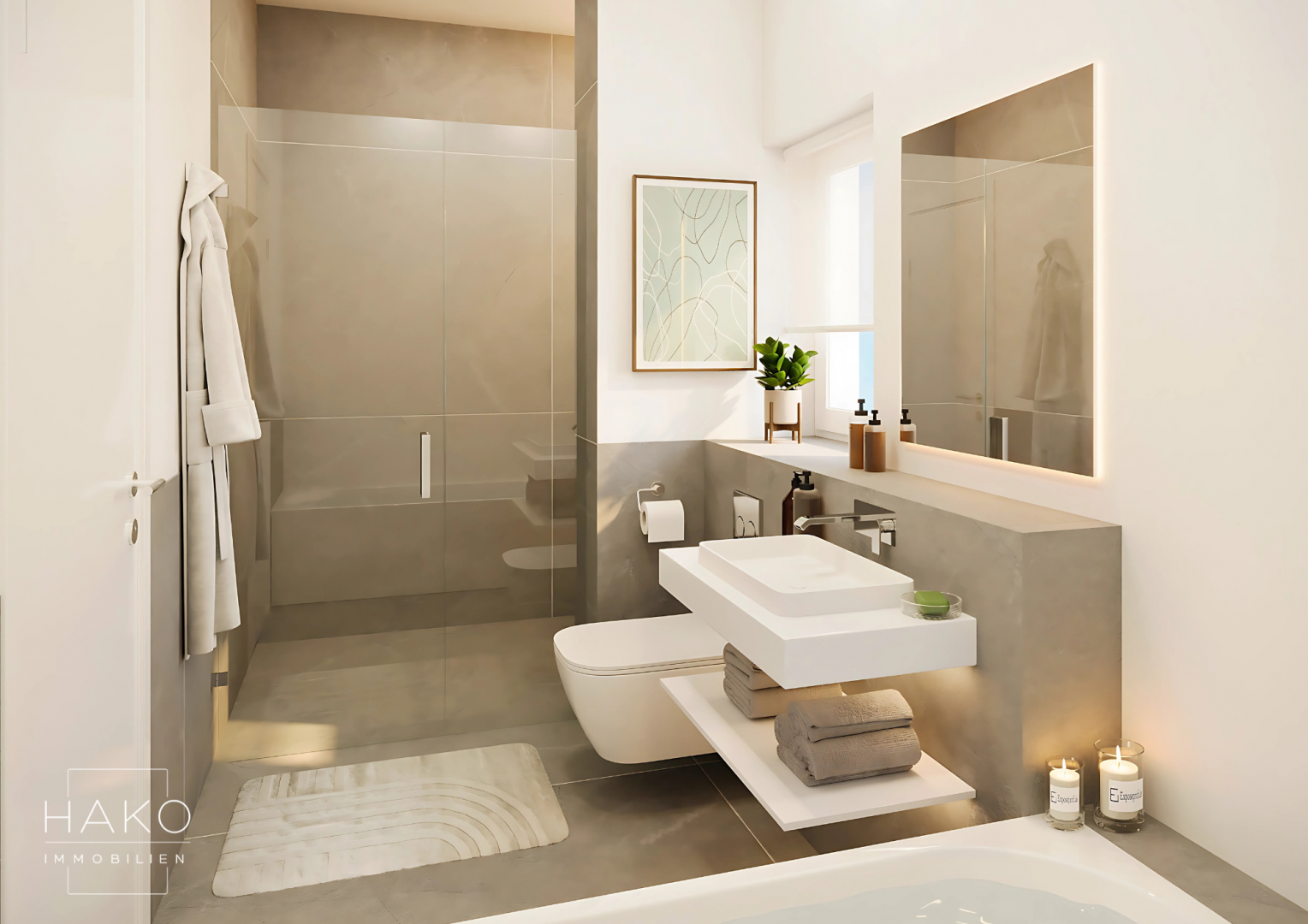 Die stilvollen Badezimmer bieten eine Wohlfühlatmosphäre mit hochwertigen Sanitäranlagen, großformatigen Fliesen und eleganten Armaturen – ein Ort der Entspannung nach einem langen Tag.