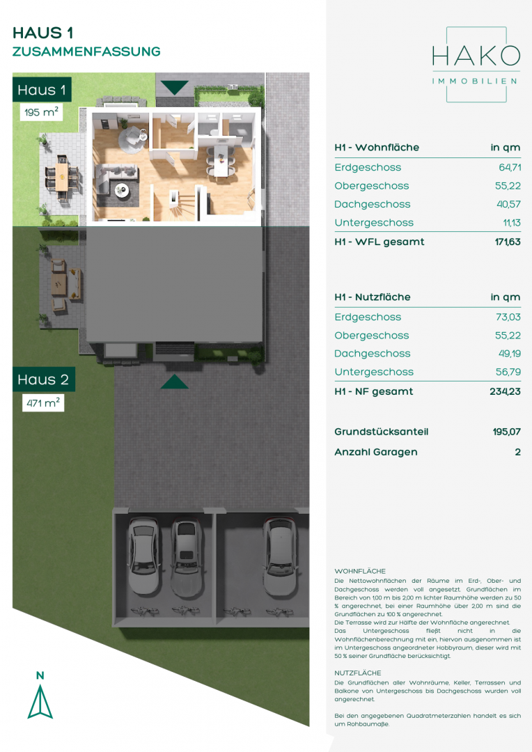 Zwei Garagenstellplätze für insgesamt 30.000,00 € stehen Ihnen in Ihrem neuen Zuhause selbstverständlich ebenfalls zur Verfügung – eine komplette Immobilie, die Ihnen alles bietet, was Sie für Ihr neues Leben brauchen.