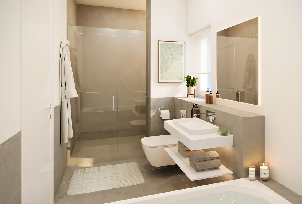 In den Tageslichtbädern erwartet Sie eine entspannte Atmosphäre, ausgestattet mit hochmodernen Sanitäranlagen, großformatigen Fliesen und hochwertigen Armaturen. Hier können Sie zur Ruhe kommen und den Alltag hinter sich lassen.